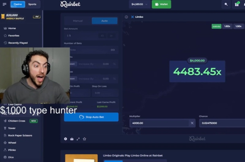 While streaming Rainbet for the first time, Hunterowner landed a 4,000x multiplier on Rainbet Limbo to turn a $1 bet into $4,000.