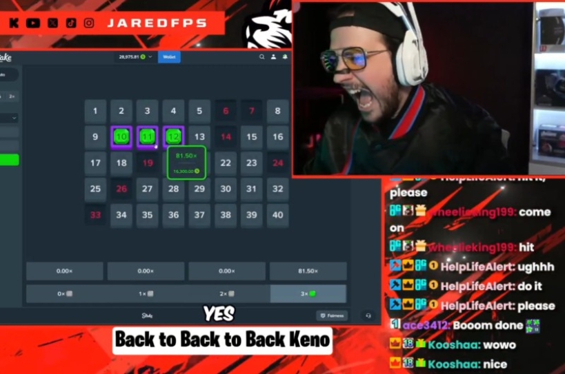 Stake.us Partner and Streamer JaredFPS Wins Back to Back to Back on Stake Keno