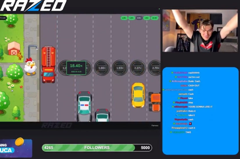 While streaming the action live on Kick, Razed Casino player Luca decided to try and cross the road on Cross the Road - one of the platform’s Un-Originals.