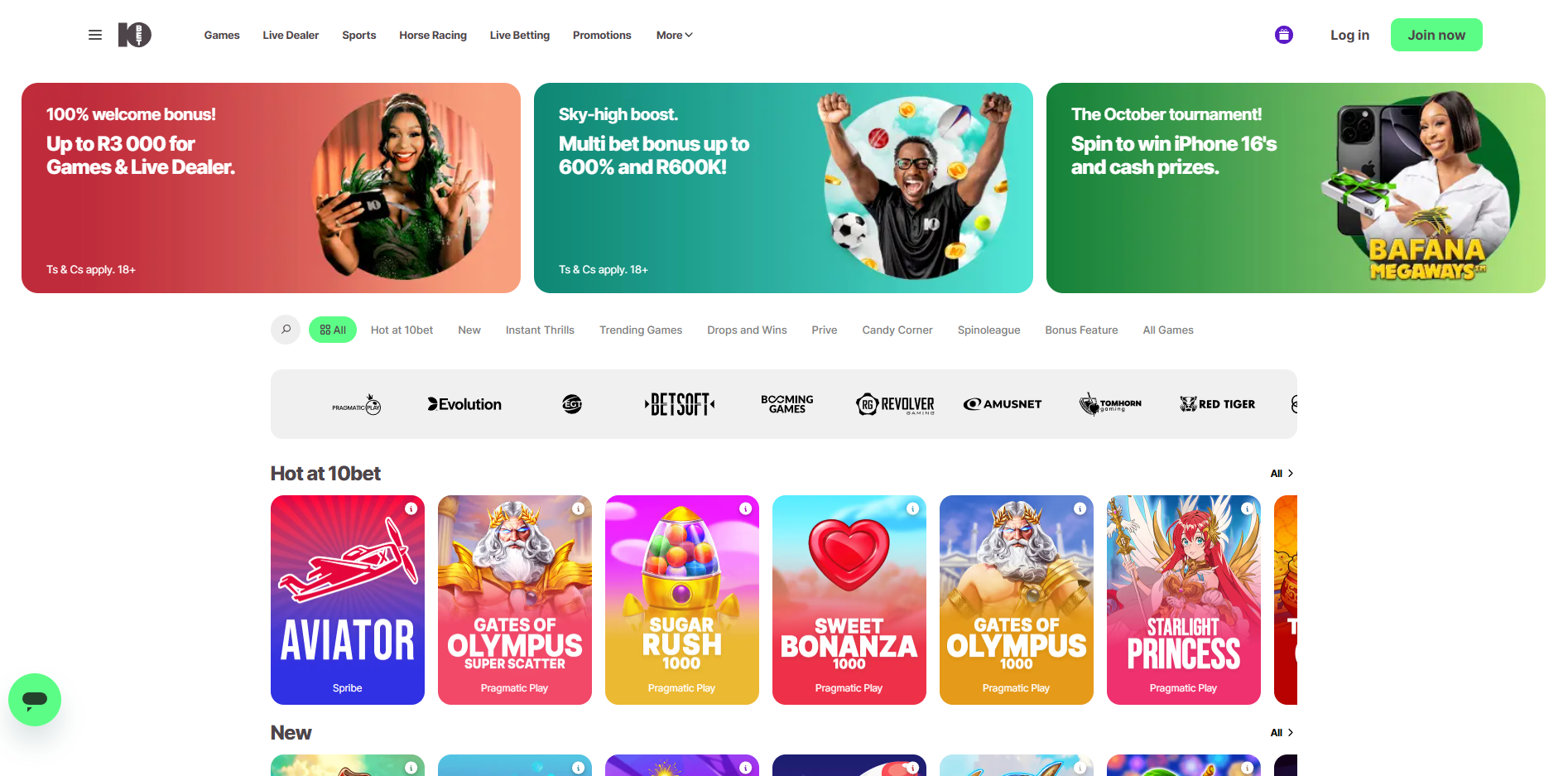 10Bet Casino | NEWBONUS | 100% up to R3,000 | R20.00 | 40x |
