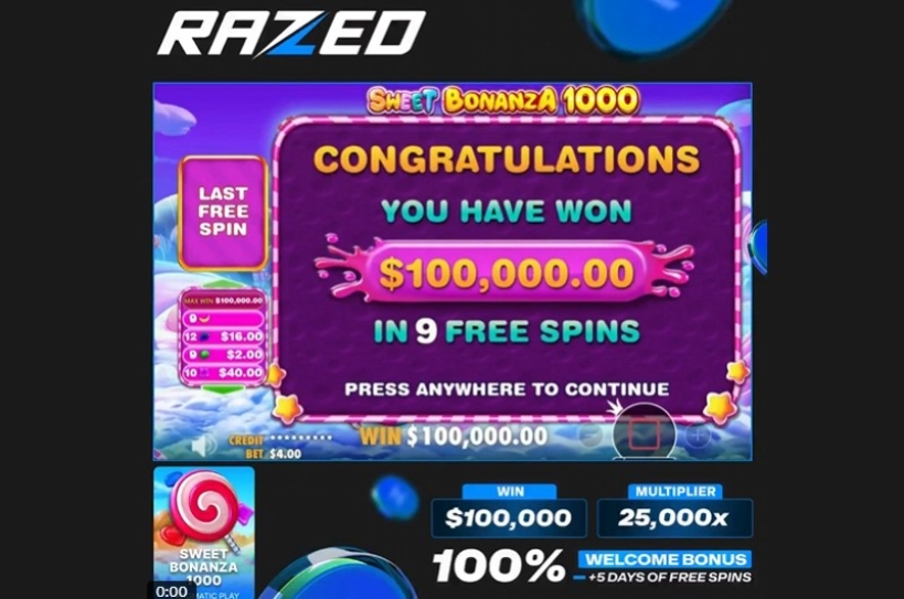 - $4 bet turns into $100,000 win at Razed Casino’s Sweet Bonanza 1000.