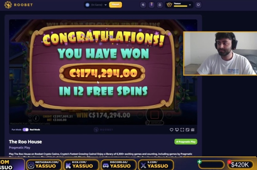 100T creator Yassuo wins C$174,294.00 during a round of Free Spins while playing The Roo House by Pragmatic Play at Roobet.