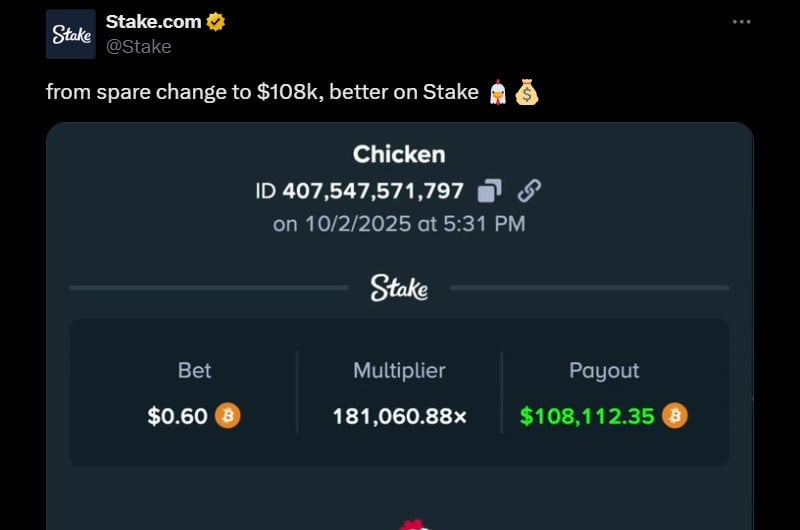 On the 6th of October 2025, a player on the crypto casino platform Stake recorded a notable win while playing the game ‘Chicken’, developed in-house as a Stake Originals game.
