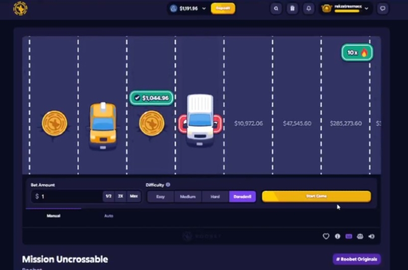 Mission Uncrossable is a simple crash-style game on Roobet where you guide a chicken across a highway. Each lane you cross safely increases your potential payout. If the chicken gets hit, you lose your bet.