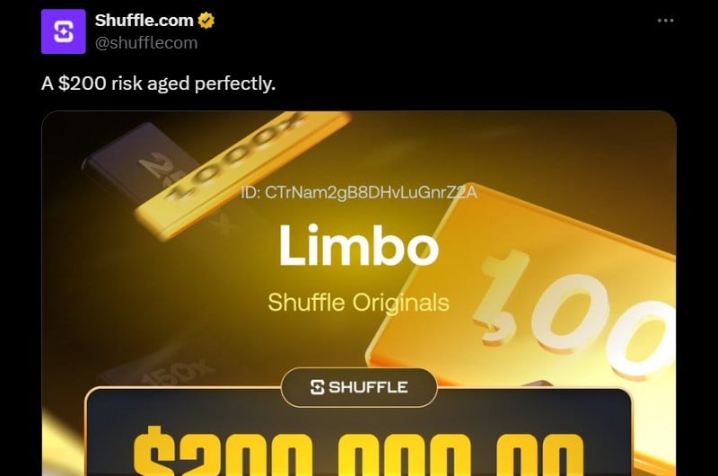 Shuffle Casino player lands 1,000x multiplier on Limbo to turn $200 into $200,000.