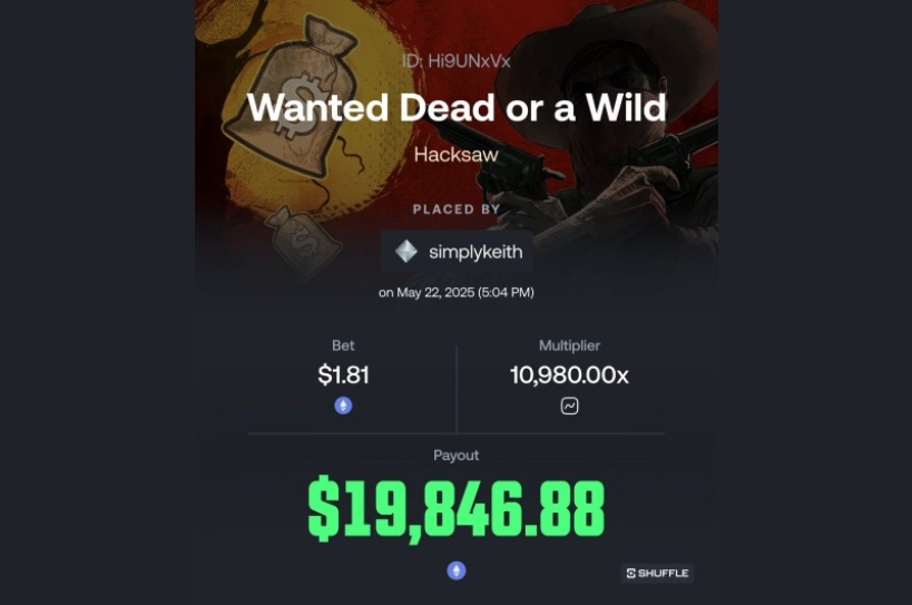 Shuffle Casino player lands a massive 10,980.00x multiplier on “Wanted Dead or a Wild” by Hacksaw Gaming to turn $1.81 worth of Ethereum into a Big Win worth $19,867.80.