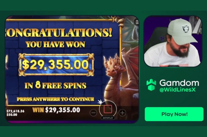 Gamdom streamer WildLinesX wins $29,355 thanks to a 587.1x multiplier on a $50 bet while playing Pragmatic Play’s “Drago - Jewels of Fortune” slot.
