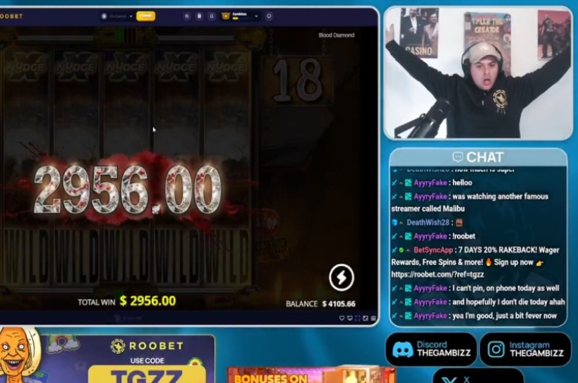Roobet streamer TheGambizz hits a max multiplier on NoLimit City’s “Blood Diamond” slot, turning a £100 Feature Buy into a $2,956.00 payout.