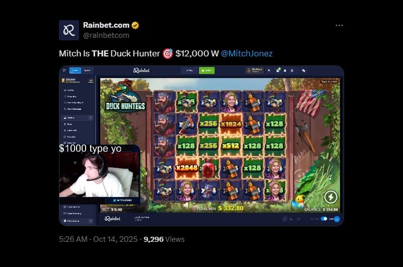 Rainbet player MitchJonez lands the 30,000x max win on NoLimit City’s Duck Hunters to turn a $0.40 bet into $12,000.