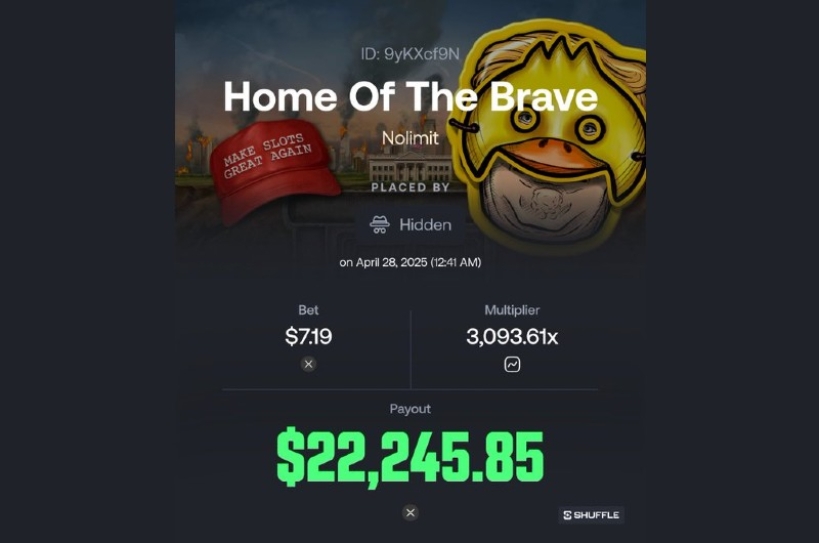 Shuffle Casino player bets $7.19 on NoLimit City’s “Home of the Brave” slot and lands a 3,093.61x multiplier to win $22,245.85.