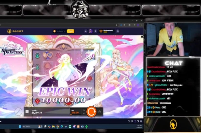 - JoeyBooHooo lands 10,000x Max Win in Rainbow Princess on Roobet.