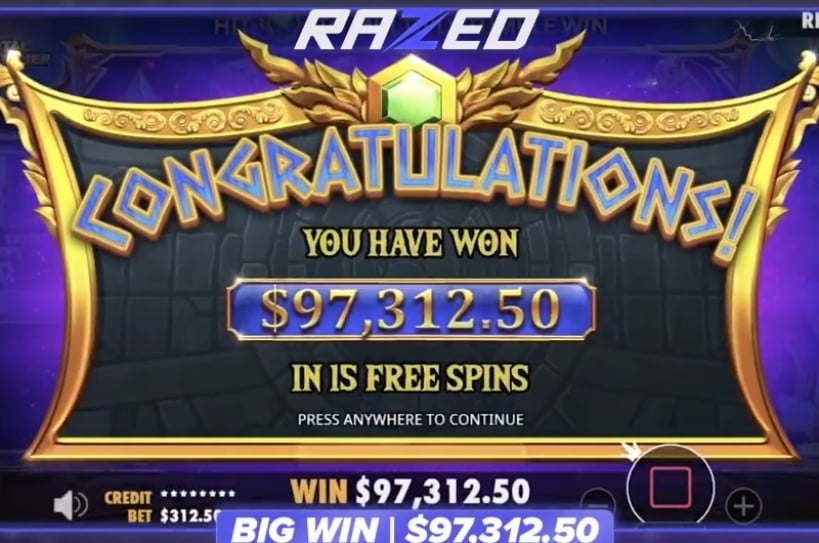 - Razed Casino player turns $312.50 bet into $97,312.50.