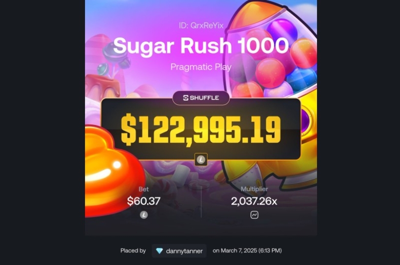Shuffle Casino player secures $122,995.19 Big Win from a $60.37 Litecoin bet while playing Pragmatic Play’s “Sugar Rush 1000” slot.