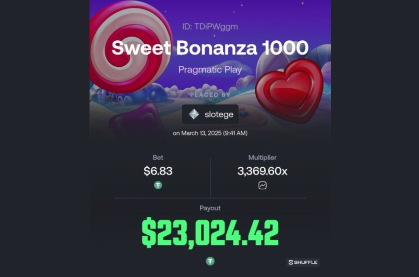 Shuffle Casino player lands a tasty 3,369.60x multiplier, turning a 6.83 USDT bet into a payout worth $23,024.42 while playing Pragmatic Play’s Sweet Bonanza 1000 slot.