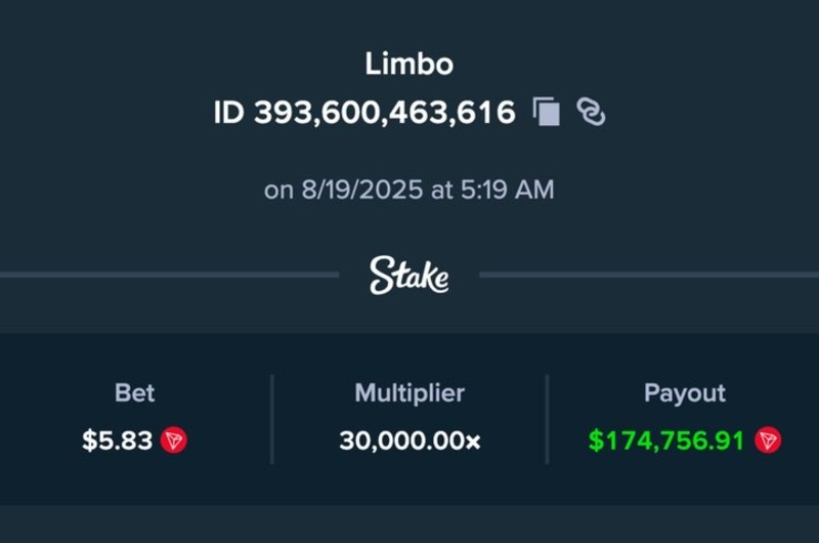 - Stake Limbo player hits 30,000x, winning $174,756.91 from a $5.83 bet.