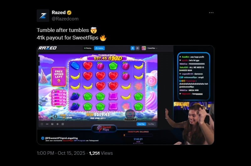 Kick streamer SweetFlips landed a sweet win during a gaming session on Pragmatic Play’s ‘Sweet Bonanza 1000’ slot at Razed Casino.