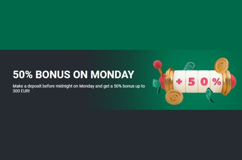 - As long as you make a deposit of at least €5 on Monday, you’ll get a 50% bonus.